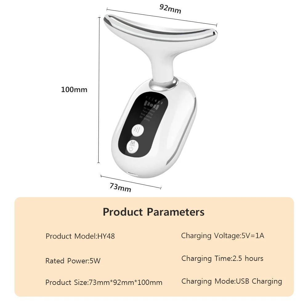 Paired with photon light therapy, the device helps brighten dull skin, refine texture, and improve overall radiance, while soothing vibration massage increases circulation and relaxation. Designed for multiple benefits in one handheld tool, it targets sagging, fine lines, and early signs of aging across the jawline, cheeks, and neck.